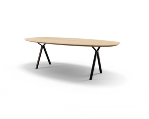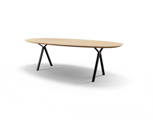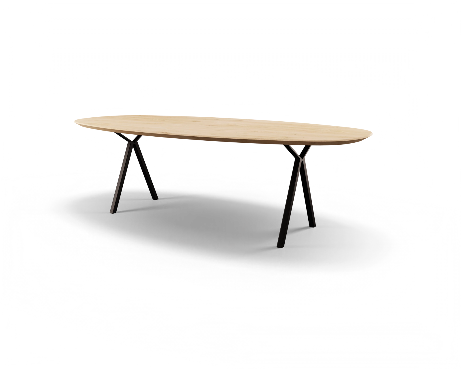 Past een rank onderstel perfect binnen het interieur? Dan is de Lazare een echte kanshebber. Combineer het stalen onderstel met een Deens ovaal tafelblad en stel het geheel naar wens samen.