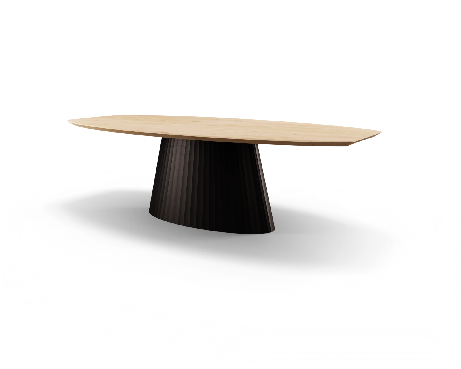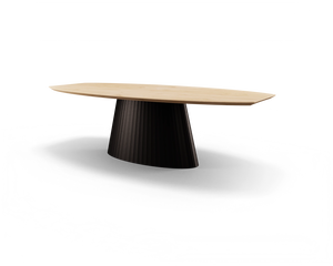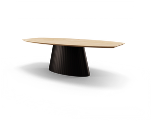 Een ovale koker die schuin naar binnen loopt vormt de basis van deze eyecatcher. Bepaal de details van het tafelblad én het onderstel zelf en kies voor maatwerk uit eigen werkplaats.